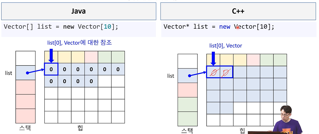 - C++는 Vector를 담을 포인터 배열을 만들어 heap에 객체 배열을 만들 수 있다.
