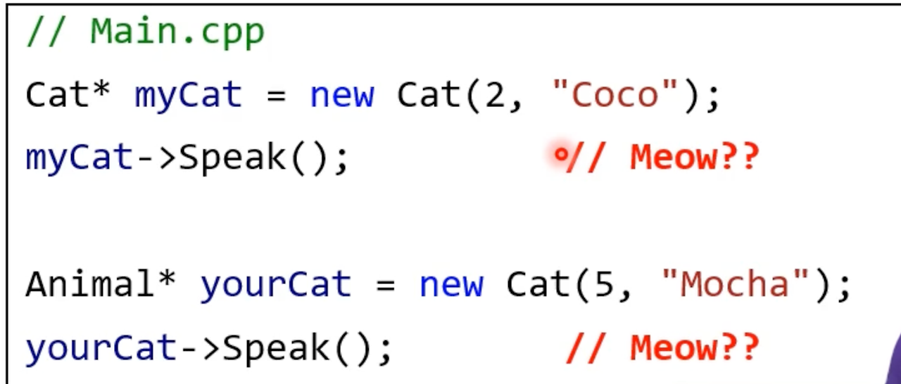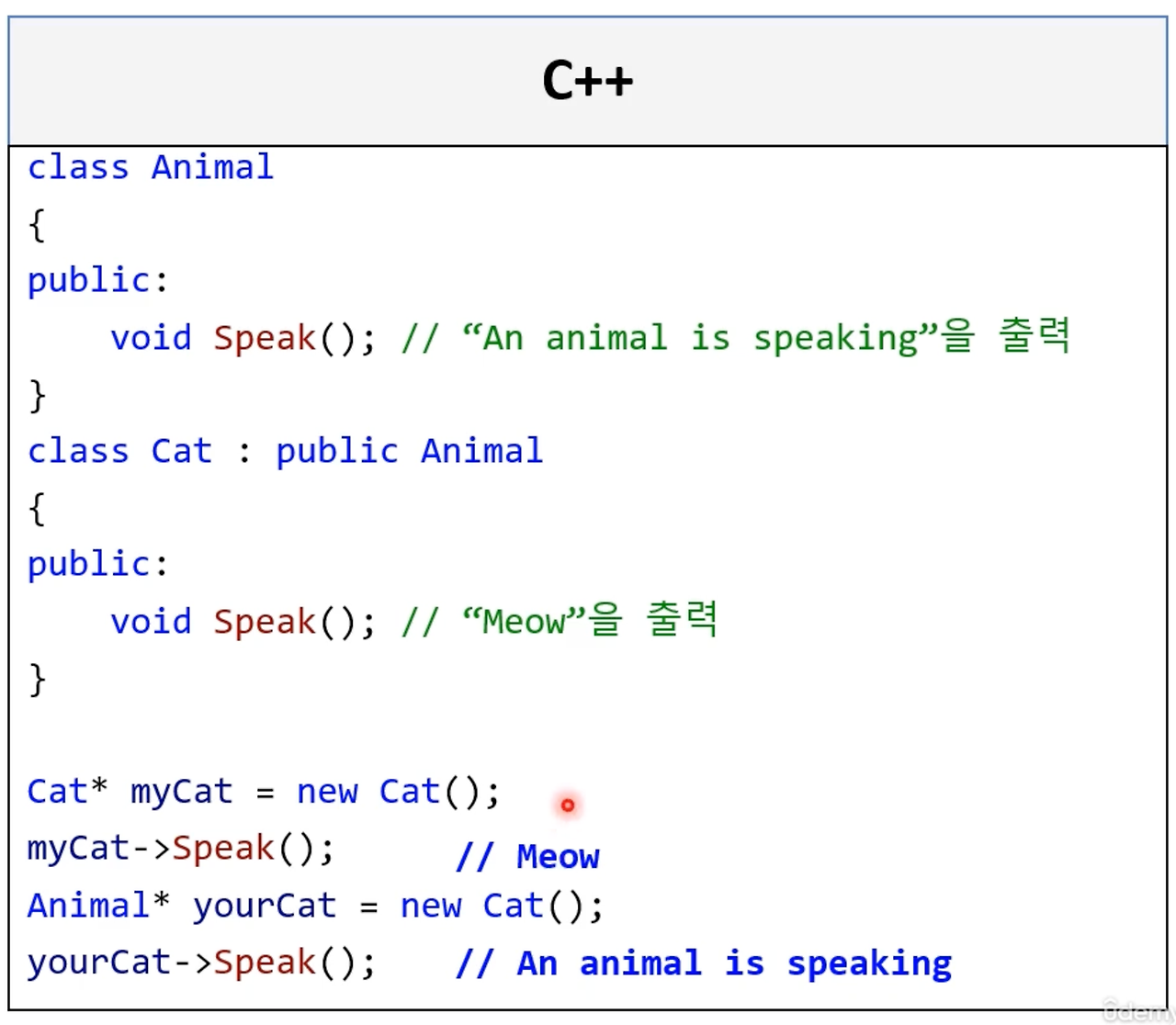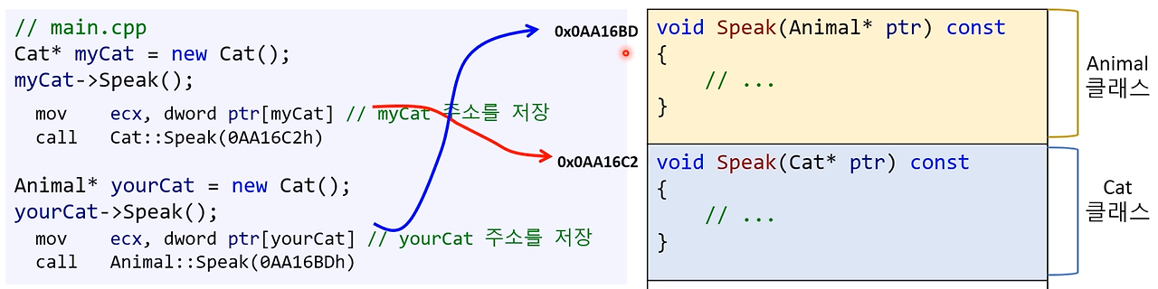 - Move()인지 Speak()인지를 가상 테이블과 대조해 결정함.