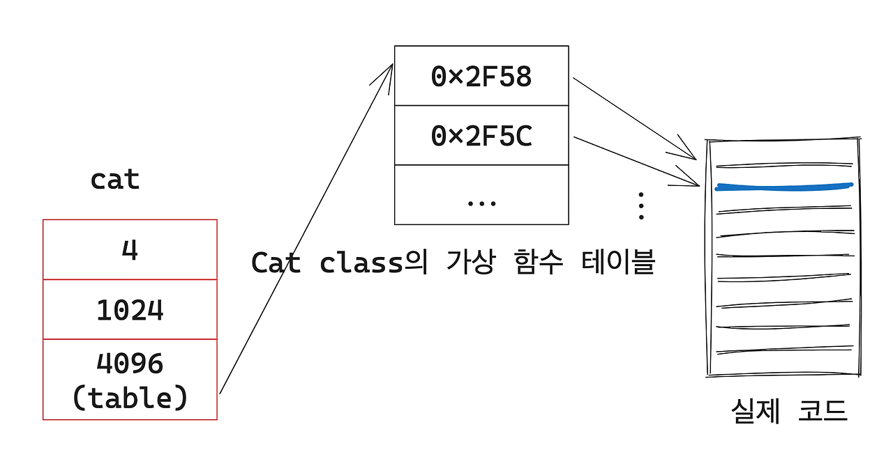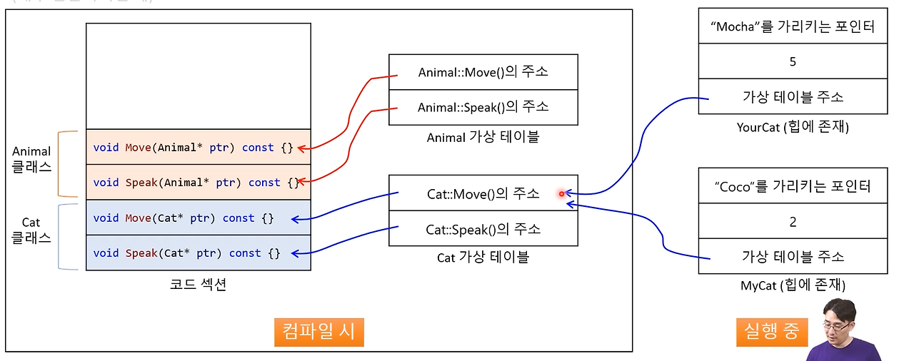 - 일단 오브젝트를 만들고 나면, 가상 테이블에 따라서 멤버 함수의 포인터가 연결됨.