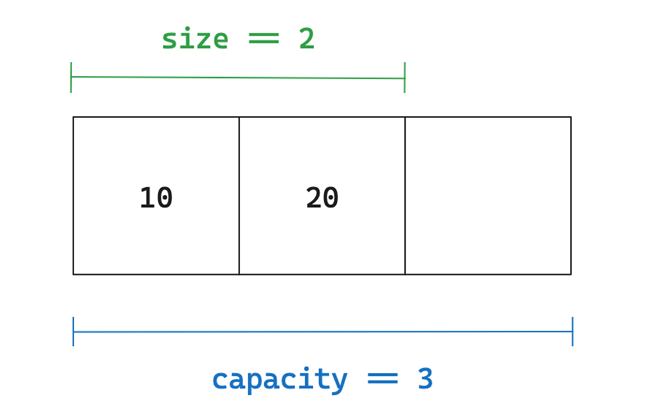 capacity(): vector에 할당된 요소 공간 수 (최대 들어갈 수 있는 요소의 수)size(): vector에 실제로 들어있는 요소의 수