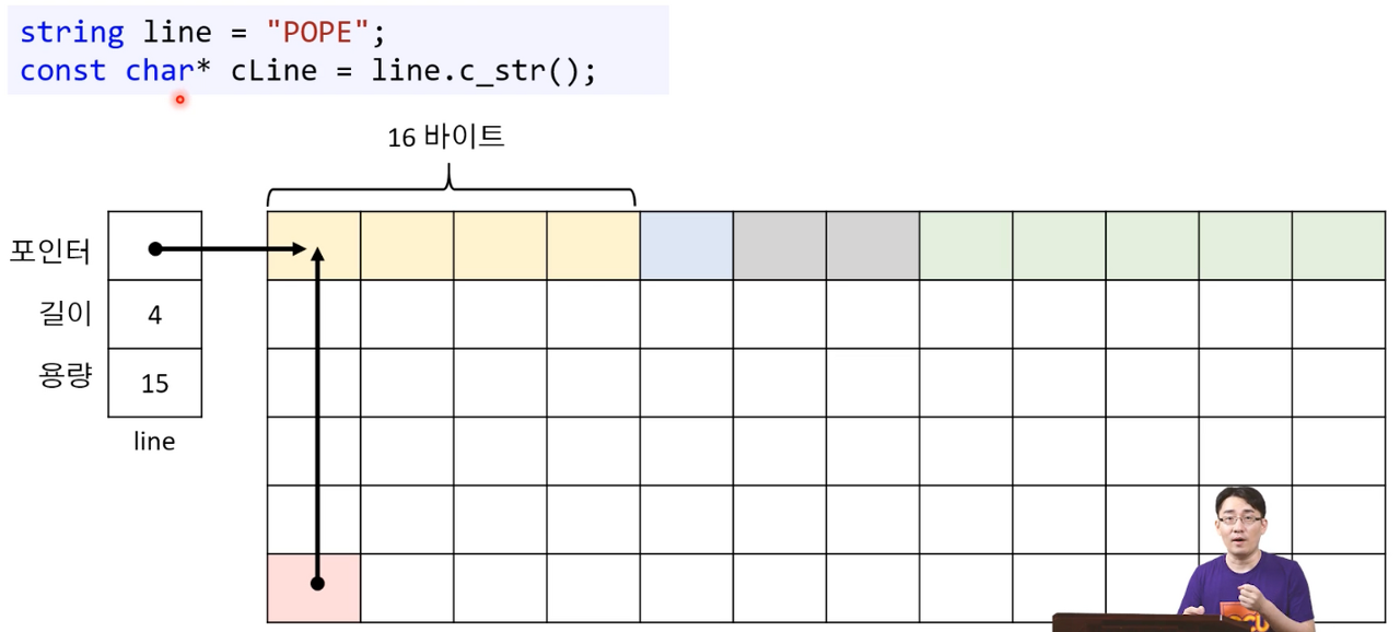 → C로 작성된 코드와의 호환성 및 시스템 콜 함수 사용등 문자열 자체를 요구하는 경우가 있으므로, string 클래스 자체가 아닌 C스타일의 캐릭터 배열을 가져올 수 있어야 한다.
